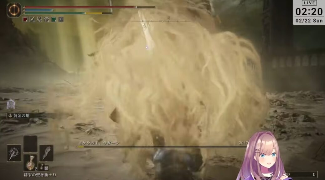 ミケラの王ラダーンになると全ての攻撃に聖属性の光柱が追加され、攻撃力自体もさらに上がっています。ここからが本当の戦いと鈴原さんもわかっているようです。