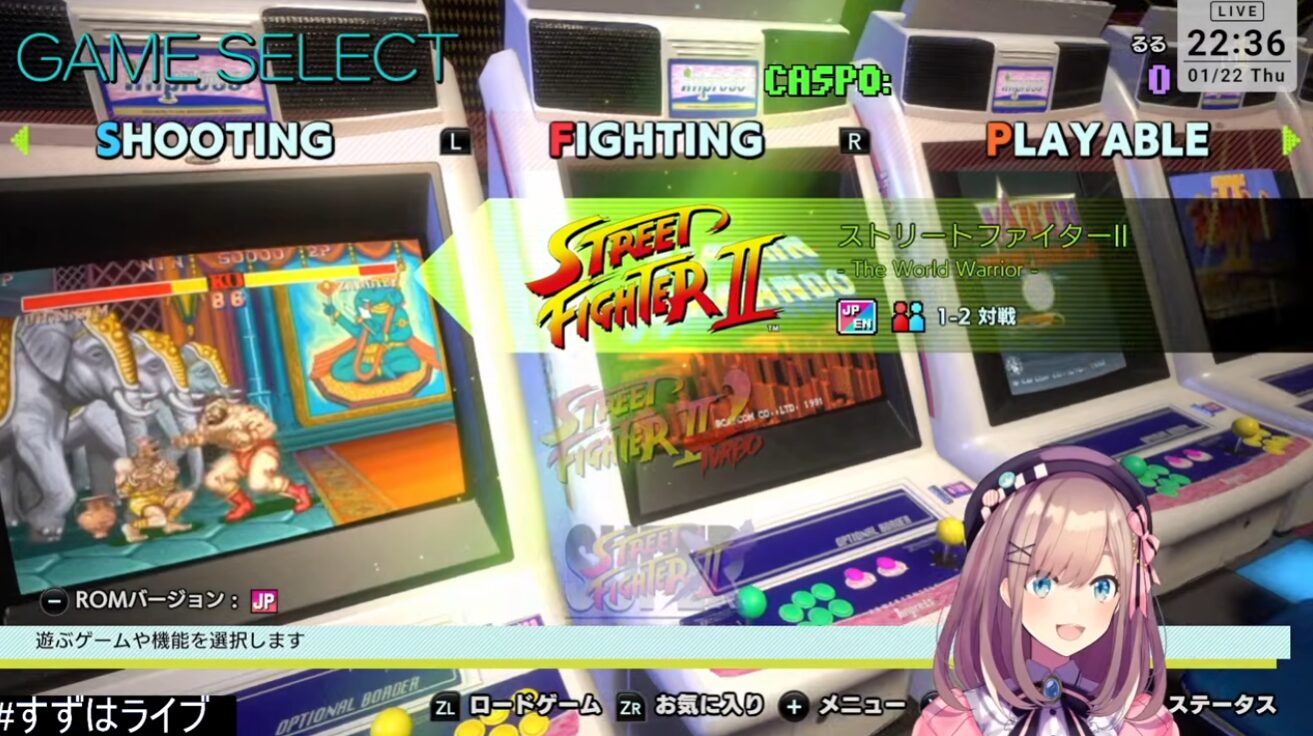 2019年にスーパーストリートファイターⅡとストリートファイターⅡ´plus(メガドライブ版発売時の名前で実際はダッシュとターボ)に挑戦したこともある鈴原さん、令和にスト6ではなく、ストⅡを選ぶところがまた鈴原さんらしくもあります。今回はカプコンアーケードスタジアム収録のアーケード版ストⅡをプレイ。
